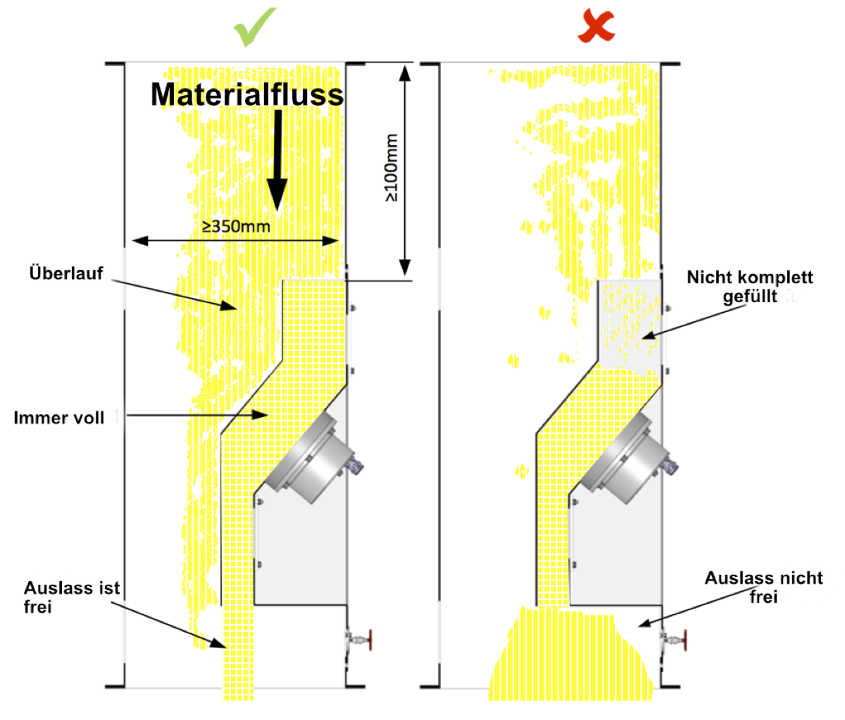 Die Messung von organischen Materialien, die im Vergleich zu Baustoffen eine deutlich geringere und oft auch variable Dichte aufweisen, empfiehlt es sich, den Materialfluß über den Sensor zu kontrollieren und damit Störungen durch Schwankungen in der Material-Flußdichte zu minimieren.