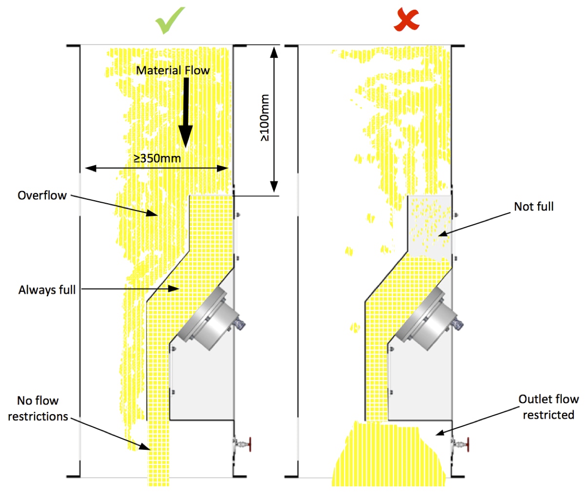 For measuring the moisture in organic materials in which the density compared to construction materials is much lower and often variable it is highly recommended to control the material flow over the sensor surface to minimize potential errors related to the material density.